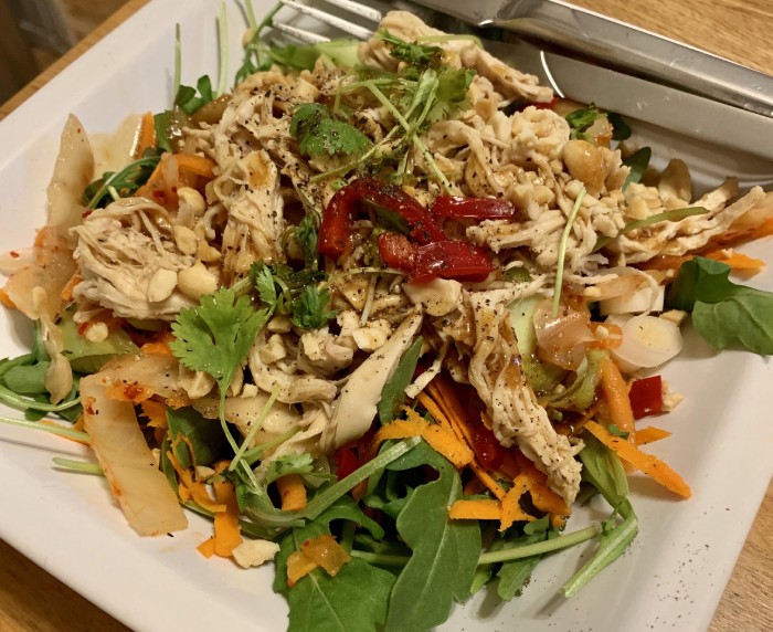 Salata de pui : 2 cani de salata verde taiata marunt, o jumatate de cana cu morcovi rasi, un sfert de avocado decojit, taiat bucatele, o felie de ou fiert, cateva bucatele de pui la cuptor sau preparat la rotisor si 2 linguri de ulei de masline.
