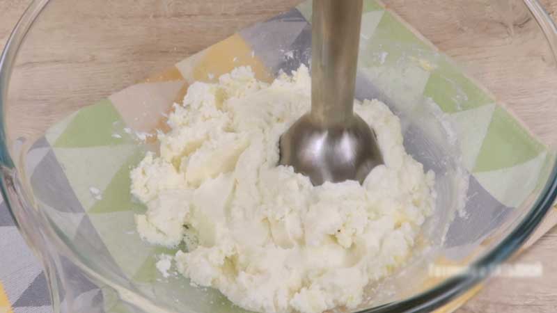 Amestec ingredientele împreună cu un blender. Adaug fulgii de cocos la amestec. Puteți face brânza fără cocos, daca vreti. Amestec și transfer compozitia de brânză de vaci într-un poș.