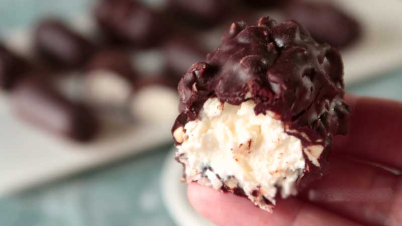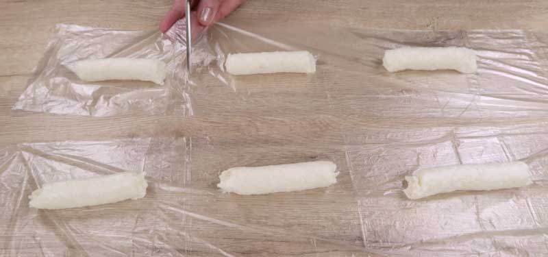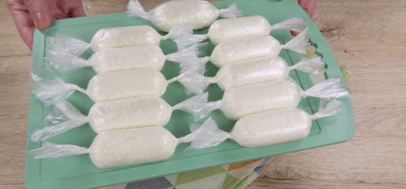 Tai folia în dreptunghiuri. Înfășor branza în folie sau in hârtie de ambalat. Învârt capetele hârtiei. Pun rulourile de branza în congelator timp de 2-3 ore. Compozitia de brânză de vaci ar trebui să înghețe.