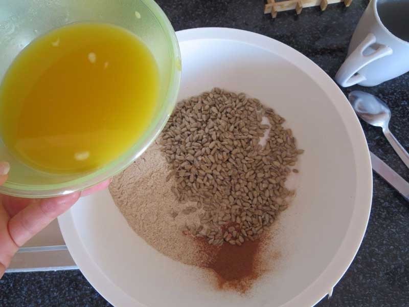 Într-un bol mare, adăugăm fulgii de ovăz, făina, semințele de floarea-soarelui, scorțișoara, esența de vanilie, bicarbonatul de sodiu, apa fierbinte și, la final, margarina topită cu mierea.