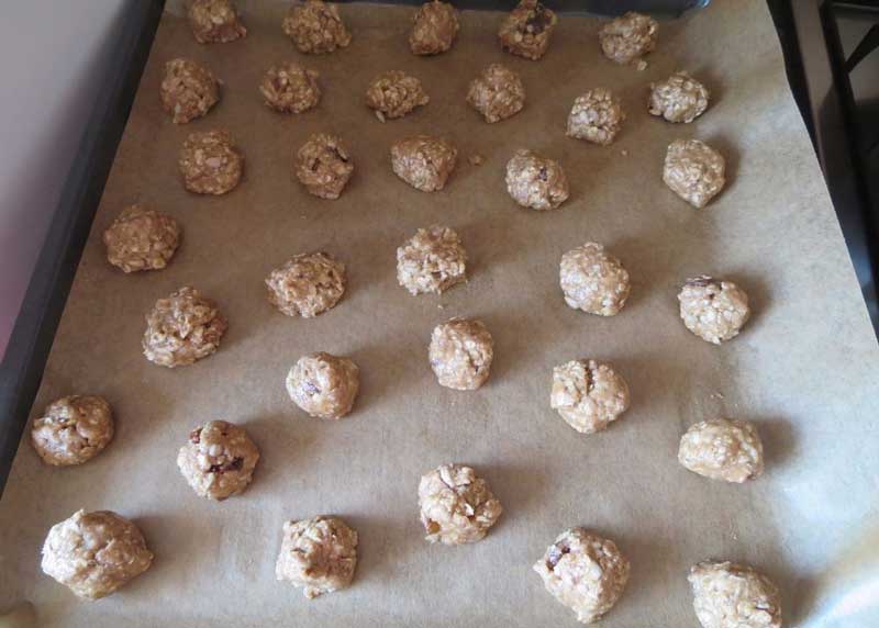 Formăm din aluat mici biluțe, pe care le așezăm pe tava de copt, lăsând spațiu suficient între ele. Este recomandat să lăsați o distanță mai mare decât în imagine, deoarece aluatul se va întinde în timpul coacerii.