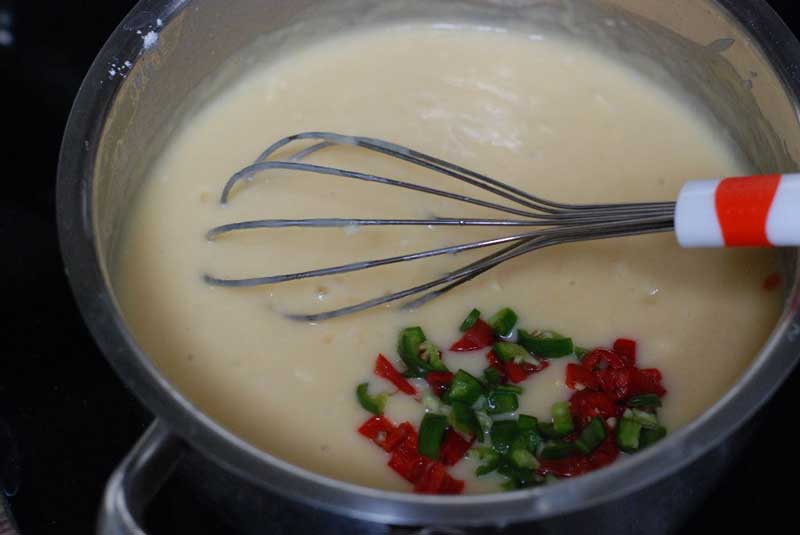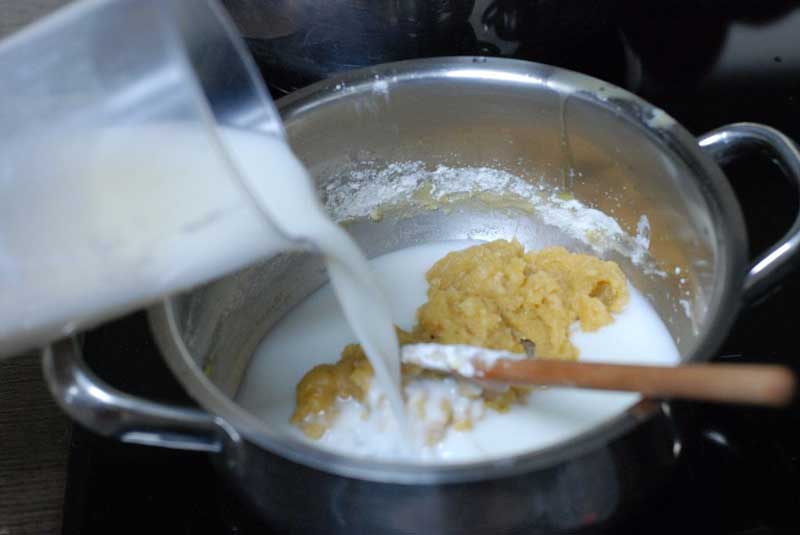 Turnăm laptele peste amestec și continuăm să amestecăm până se omogenizează.