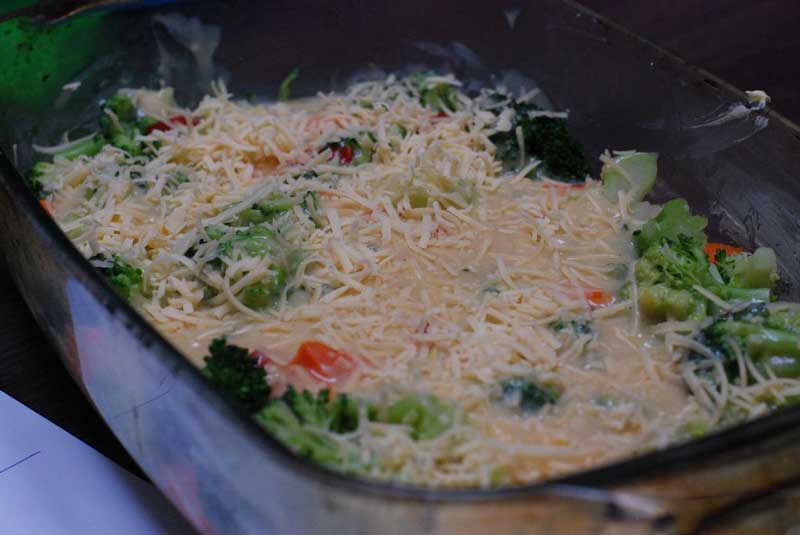 Ungem un vas termorezistent cu unt și așezăm în el broccoli și morcovii pre-fierți.