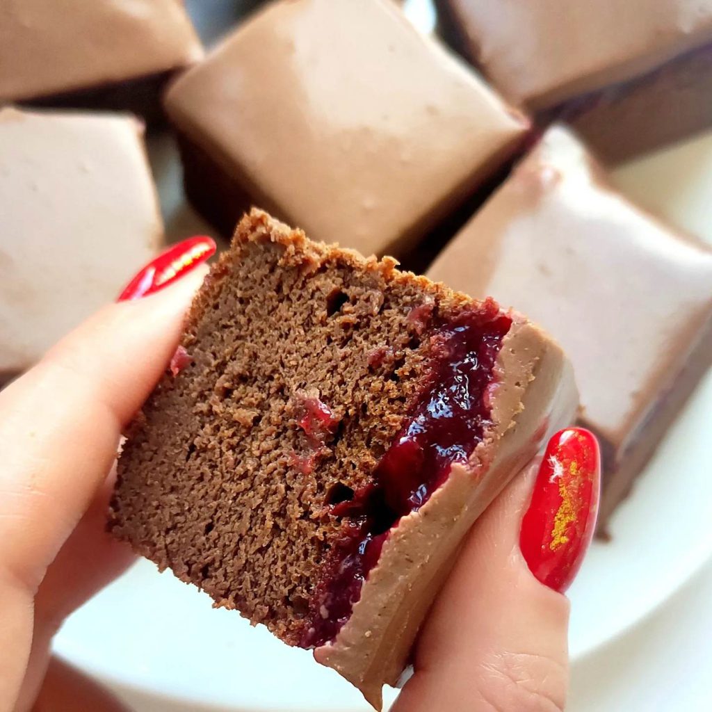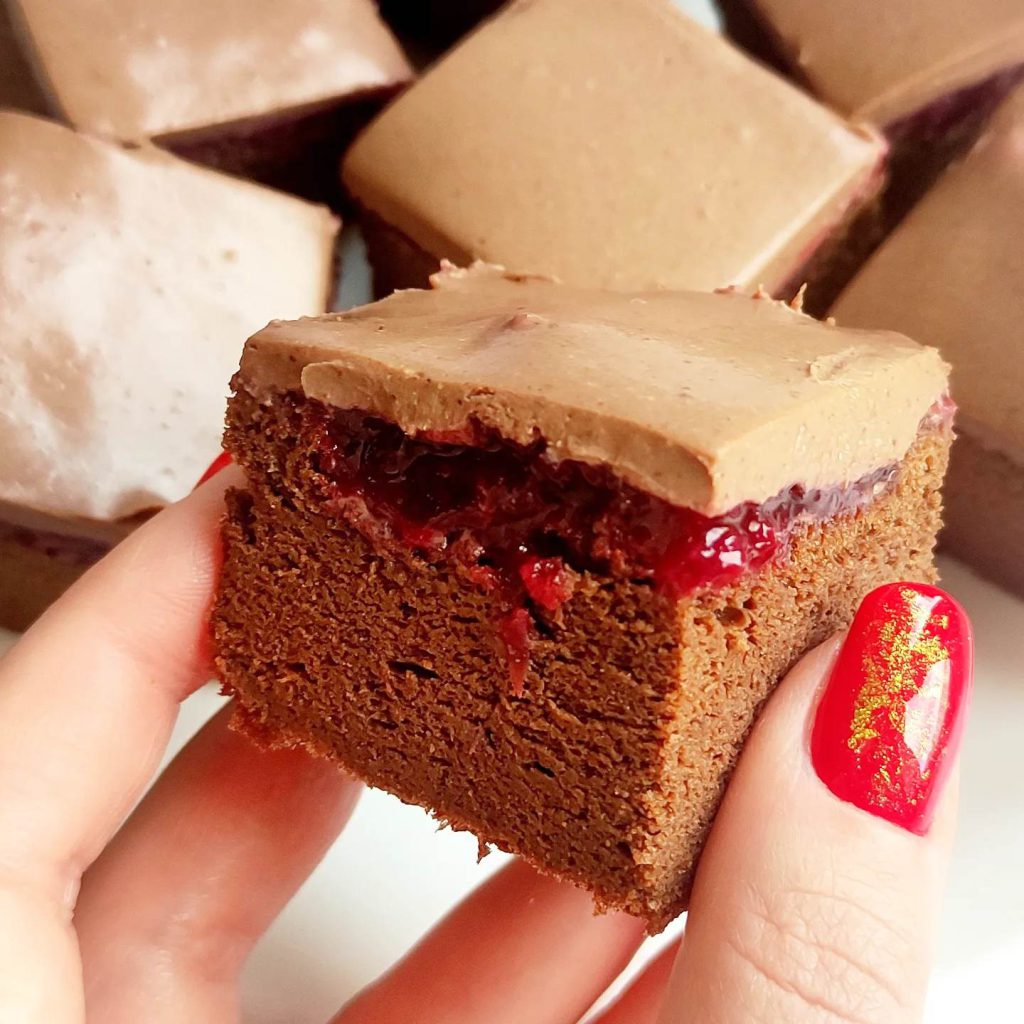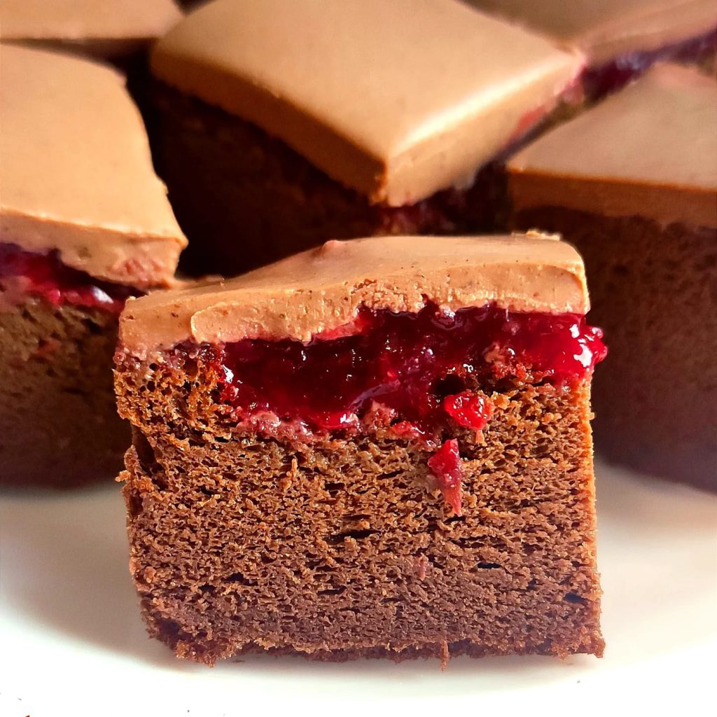 Așteaptă câteva minute, apoi, după ce scoți prăjitura din tavă, îndepărtează “crusta” de la suprafață și unge cu gem – eu am folosit gem de vișine fără zahăr.