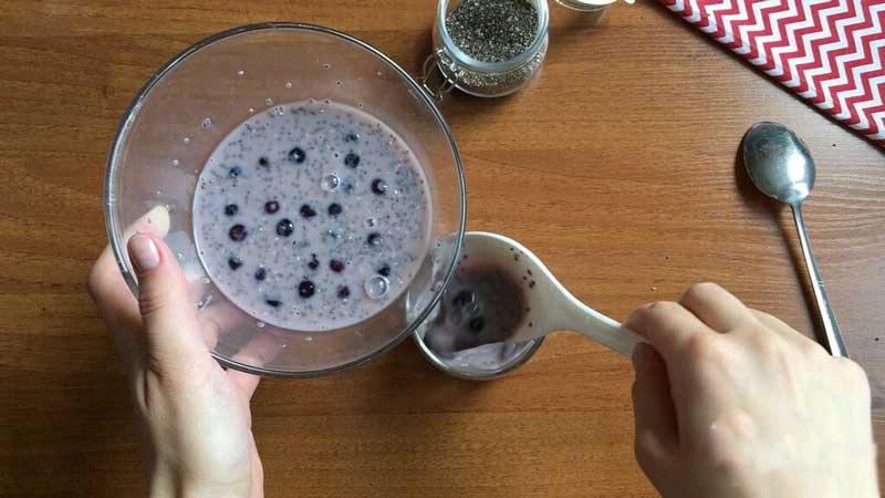Într-un bol, puneți semințele de chia, adăugați fructele de pădure, mierea și orice tip de lapte sau iaurt și amestecați cu un tel.