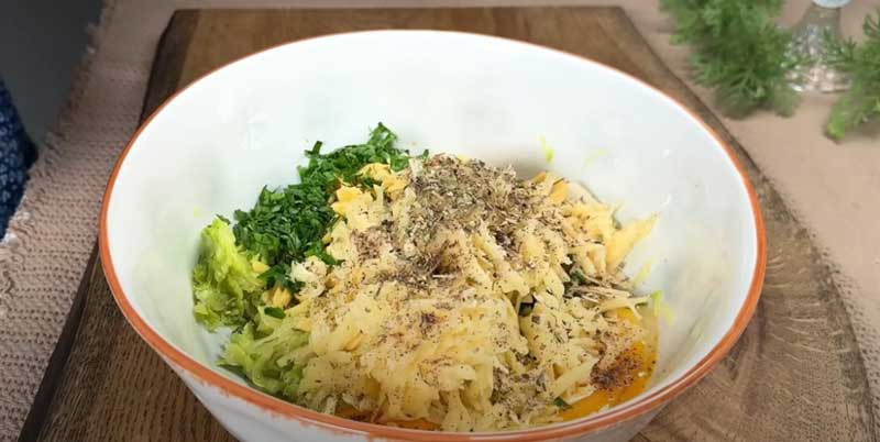 Adăugați ouăle, brânza, pătrunjelul, cartoful ras și usturoiul. Adăugați sare, piper negru, ierburi și paprika.