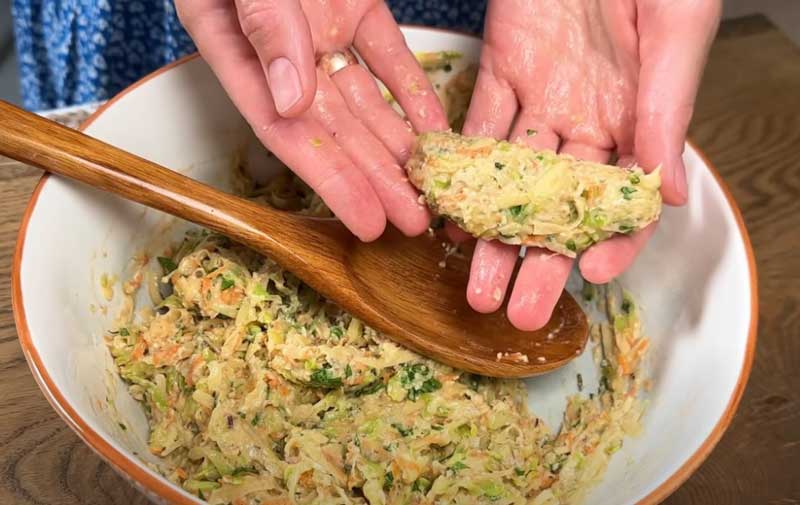 Radeți dovlecelul și lăsați-l să stea timp de 15 minute. Stoarceți excesul de apă și adăugați morcovul ras.