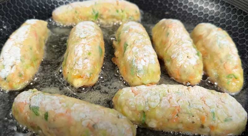 Formați chiftele mici, acoperiți-le cu făină și prăjiți-le într-o tigaie cu ulei de măsline timp de 4-5 minute pe fiecare parte.