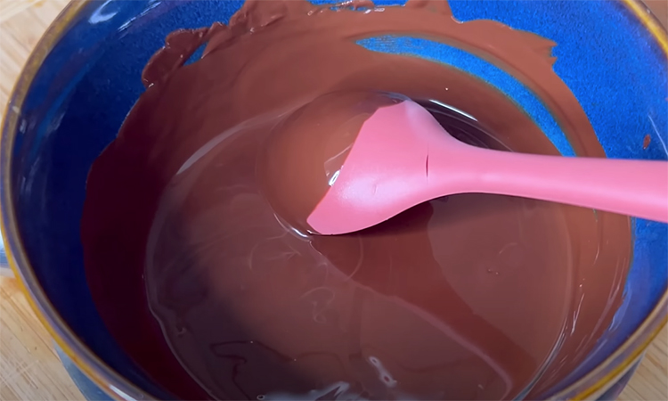 Puneți bolul cu bucăți de ciocolată neagră pe baie de apă. Topiți ciocolata, amestecând constant, până când devine o compozite omogena. Turnați treptat sucul proaspăt de portocale în ciocolata topită. Continuați să amestecați până când amestecul devine omogen.