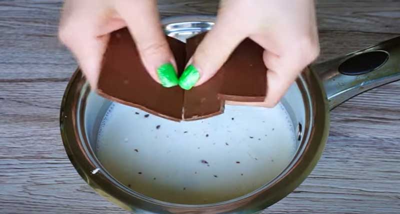Adăugați bucățile de ciocolată în amestec. Amestecați compoziția pe foc mediu până când ciocolata este complet topită.
