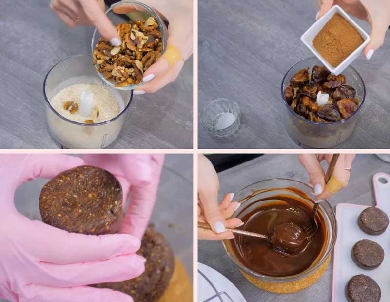 Formați praline/bomboane/prajiturele din compozitia rezultata și așezați-le pe un tocator de bucătărie sau pe hârtie de copt.