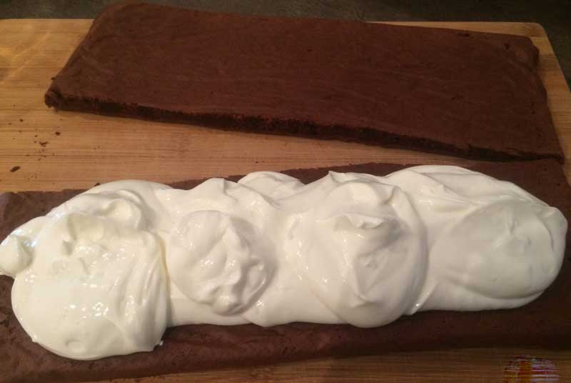 Întindem crema de brânză pe unul dintre blaturi, apoi acoperim cu celălalt blat.