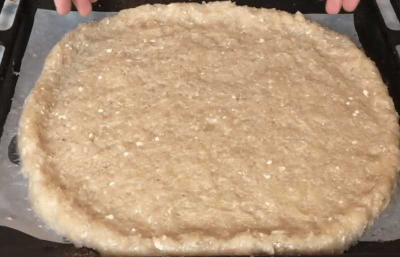 În primul rând, pregătiți baza pentru pizza. Pieptul de pui trebuie să fie tocat cu ceapa și untul. Adăugați un ou, sare, piper la carnea tocată și amestecați bine. Tapetati o tavă de copt cu hârtie și ungeți-o cu ulei. Întindeți carnea tocată sub forma unei baze rotunde, cu grosimea de aproximativ 1 cm. Coaceți baza de pizza în cuptor la 180 de grade Celsius timp de 20-25 de minute.