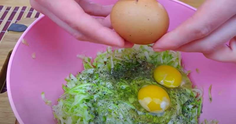Într-un castron adânc, adăugați dovlecelul ras, ouăle și busuiocul – poate fi uscat sau tocat mărunt proaspăt. Dacă brânza nu este suficient de sărată, adăugați puțină sare în plus.