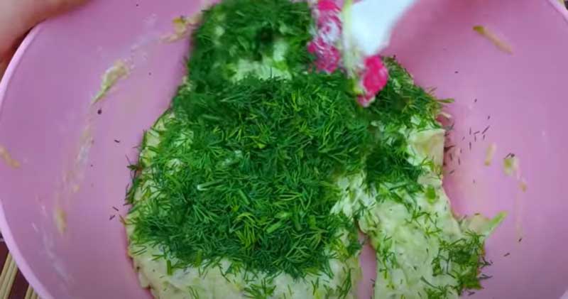 Apoi adăugați făina și mărarul tocat la această compozitie pentru a crea un aluat. Amestecați totul bine până obțineți o consistență uniformă.