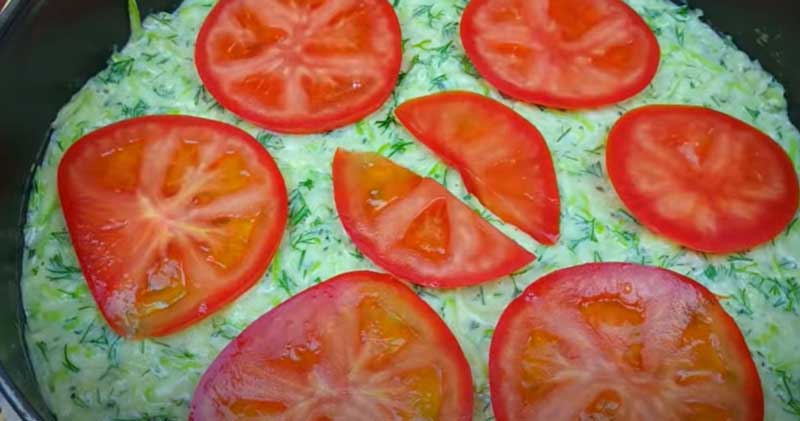 Pe aluatul deasupra, așezați felii de roșie tăiate mărunt și brânza rasă. Coaceți “pizza” din dovlecei într-un cuptor preîncălzit la 180 de grade Celsius timp de aproximativ 20 de minute.