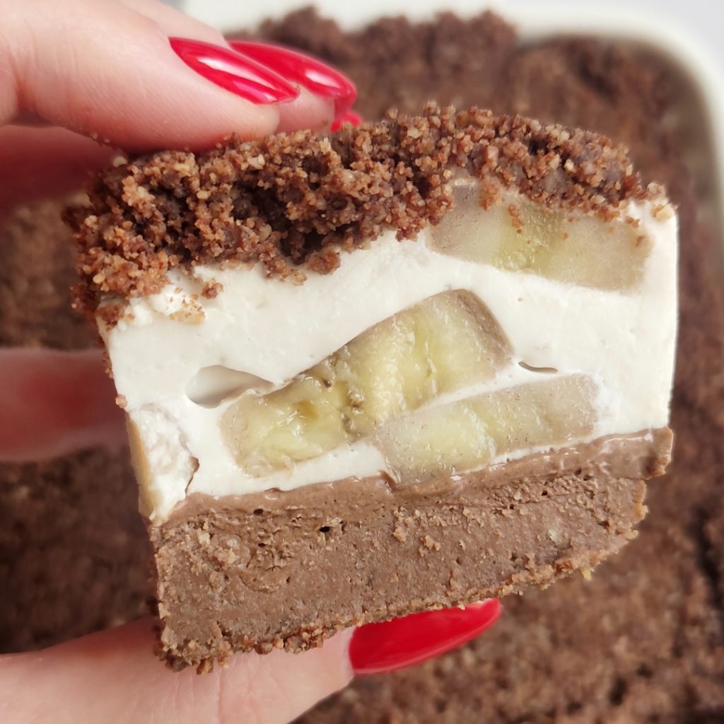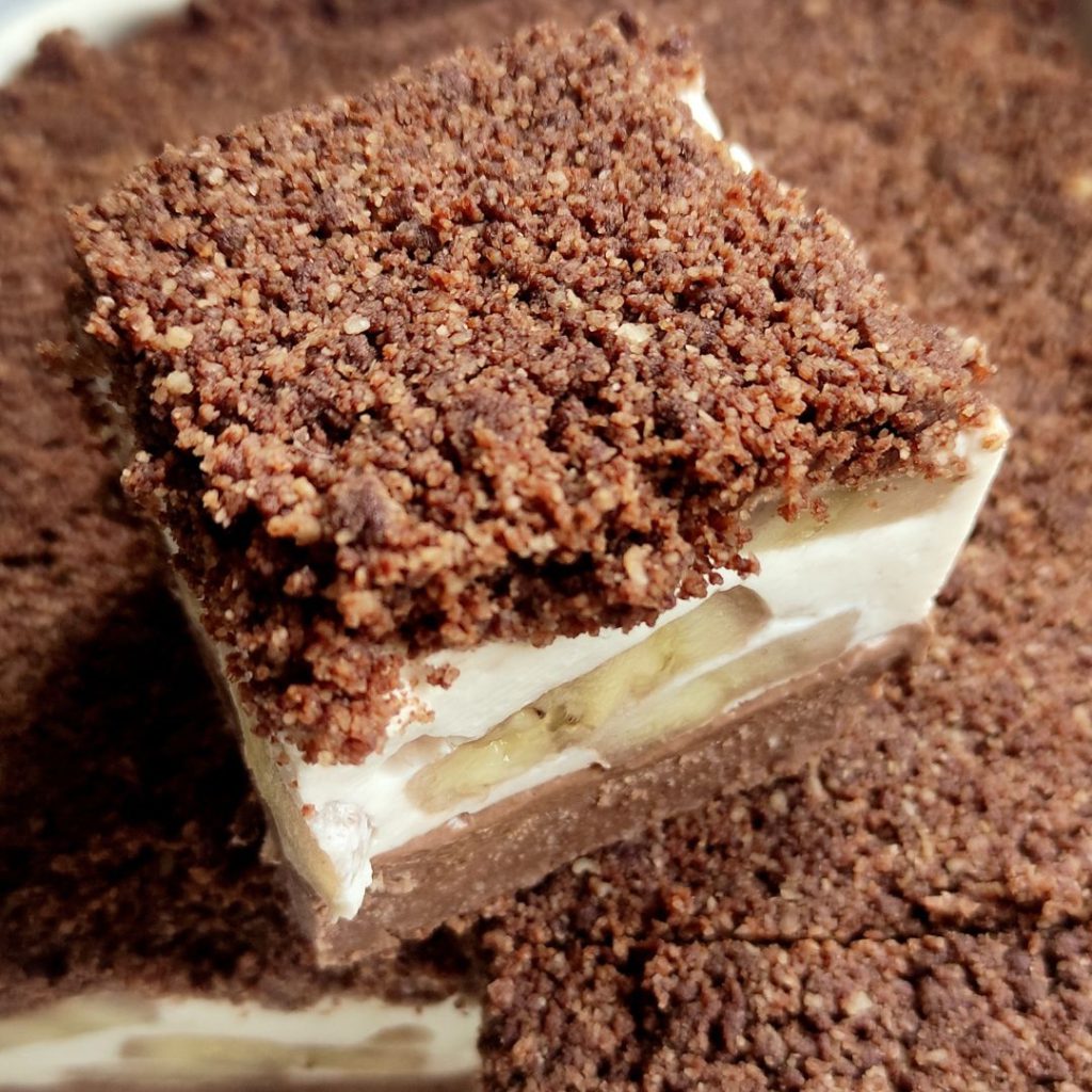 Pur și simplu topește ciocolata la bain-marie și combin-o cu făina de migdale. Presară acest amestec peste stratul cu banane și apasă ușor cu mâinile pentru ca „crumble-ul” să adere cât mai bine. Pune prăjitura la frigider până se răcește complet și e gata!
