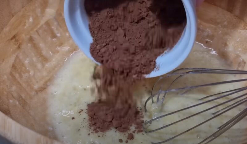 Pune bananele și vanilia într-un castron cu ouă și amestecă. Cerneți pudra de cacao în amestecul de ouă și amestecați.