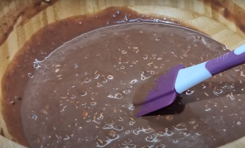 Se toarnă praful de copt în amestecul de cacao și se omogenizeaza din nou. Turnați fulgi de ovăz cu lapte răcit în amestec și combinați ingredientele.