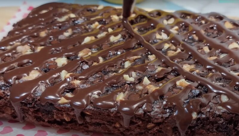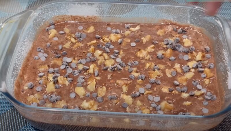 Ungeți o tavă de copt cu unt și turnați aluatul în ea. Puneți nucile în aluat și adaugati fulgi de ciocolată. Coaceți desertul la 180 de grade timp de 15-20 de minute.
