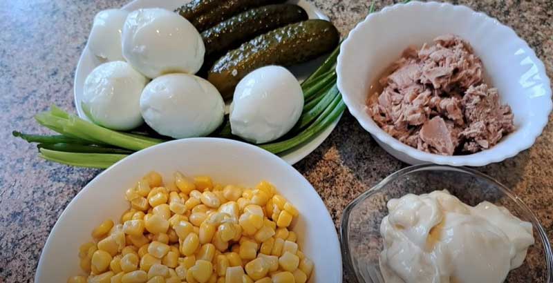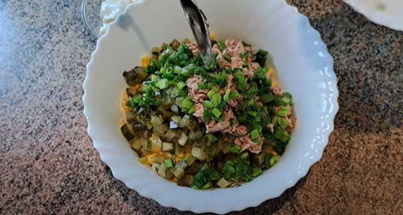 Într-un bol, amestecă ouăle tăiate, tonul, porumbul și castraveții murați.