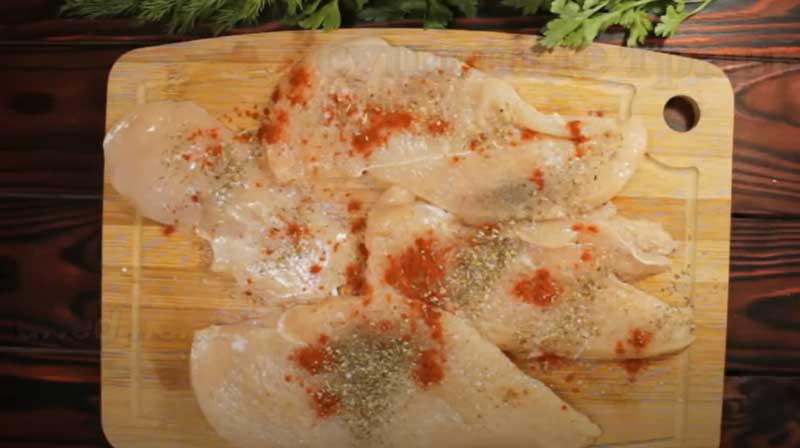 Spălați, uscați și tăiați pieptul de pui în bucăți subțiri. Condimentați cu sare, piper, boia de ardei și ierburi uscate. Lăsați-le să se odihnească timp de 15 minute în frigider.