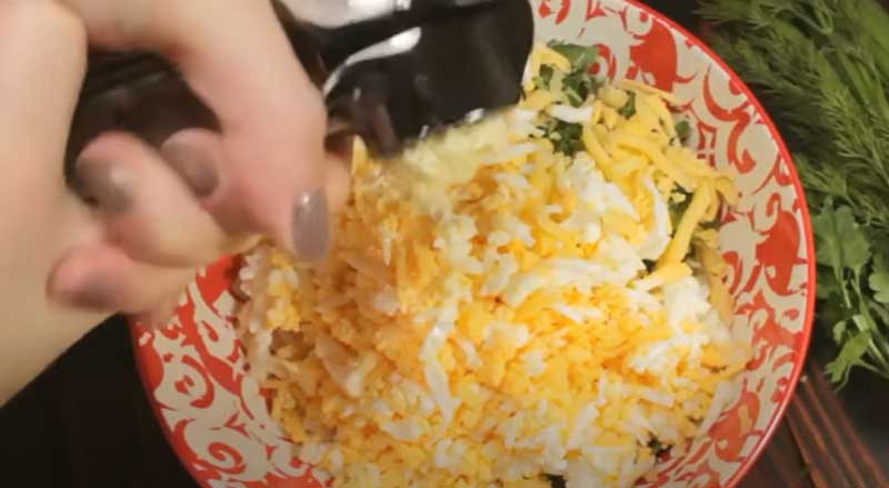 Tăiați ceapa și roșiile, radeți ouăle și brânza. Adăugați usturoiul zdrobit și amestecați.