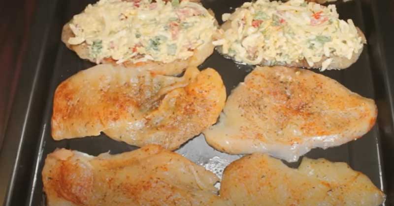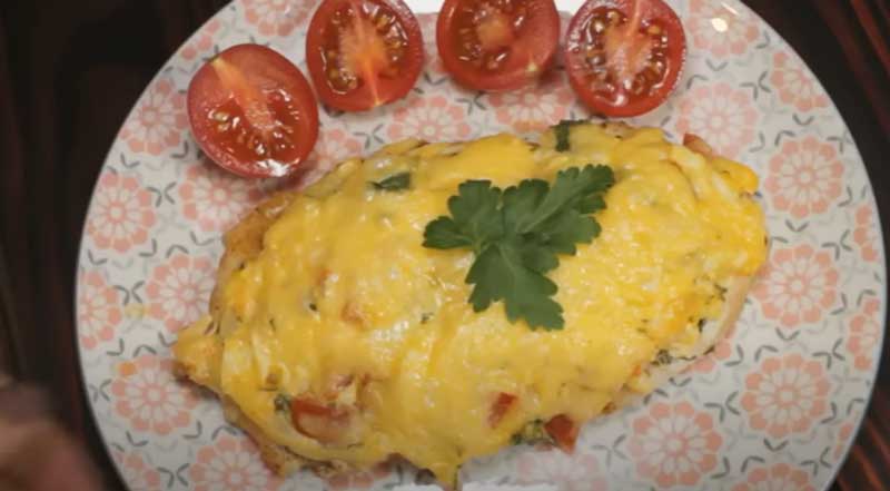 Pe o tavă unsă cu ulei, așezați feliile de pui și presărați-le cu amestecul pregătit. Presărați cu brânză și coaceți timp de 20 de minute într-un cuptor preîncălzit la 200 de grade Celsius.