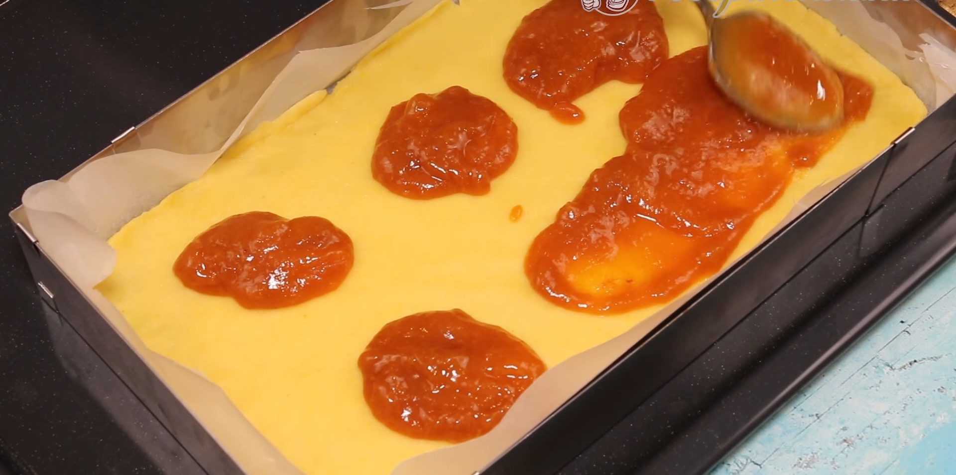 Ungem cu gem, presărăm cu umplutură de nucă și acoperim cu încă o foaie (scoasă din frigider și întinsă la mărimea tăvii. Ungem cu gem, presărăm cu nucă și repetăm straturile. Acoperim totul cu a cincea foaie.