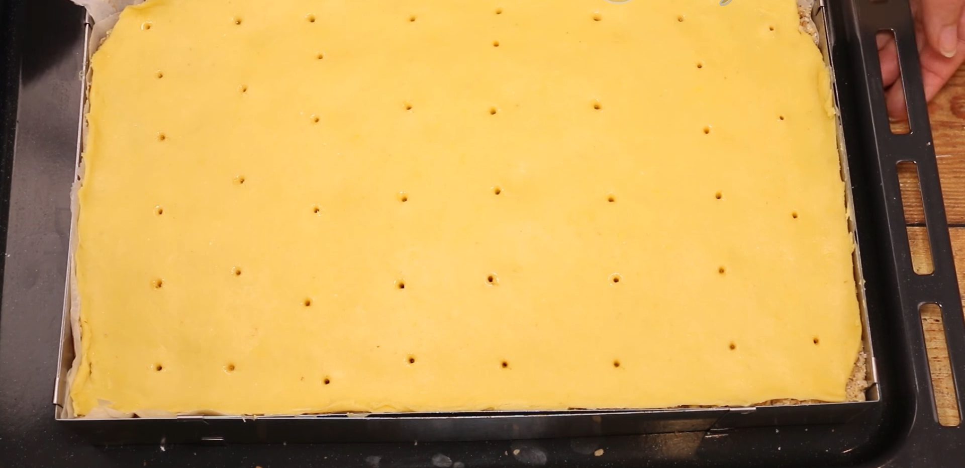 Întindem prima bilă, într-un dreptunghi un pic mai mare decât tava. Transferăm în tavă, trăgând aluatul și pe margini.