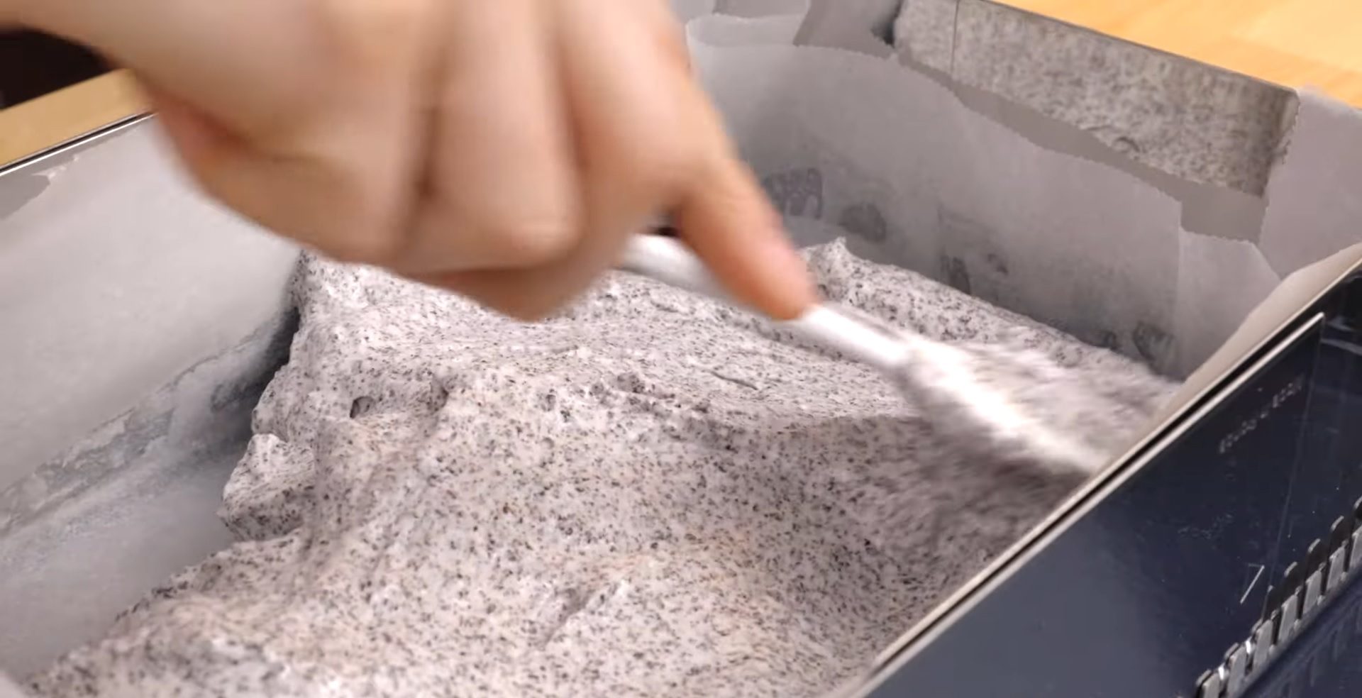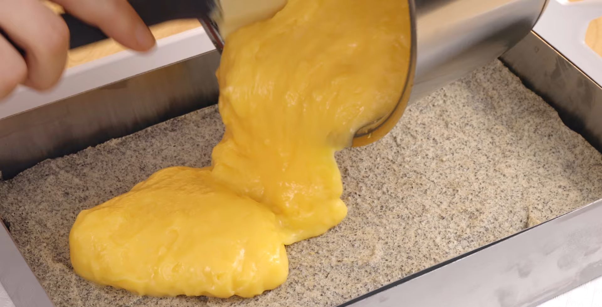 Pentru blat, începem să mixăm albușurile împreună cu un praf de sare. Treptat adăugăm zahărul pudră, mixând continuu până obținem o spumă tare și lucioasă. Cu o spatulă, încorporăm cu mare grijă praful de copt, macul și uleiul. Transferăm compoziția astfel obținută în tava pregătită și coacem blatul timp de 18-20 de minute.