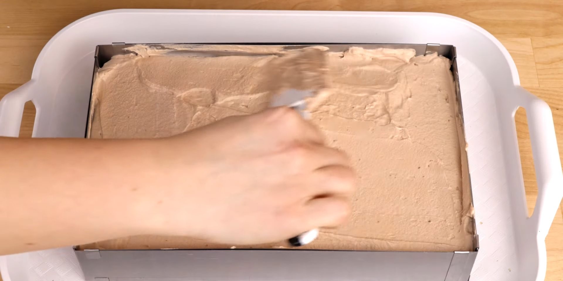 Mixăm spumă frișca rămasă și încorporăm în ea ciocolata cu gelatină. Întindem uniform peste stratul de cremă. Dăm prăjitura la frigider pentru 2-3 ore.