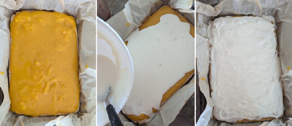 Toarnă sau întinde piureul de mango întărit și uniformizează-l. Pune prăjitura la frigider pentru aproximativ 10 minute, până se întărește.